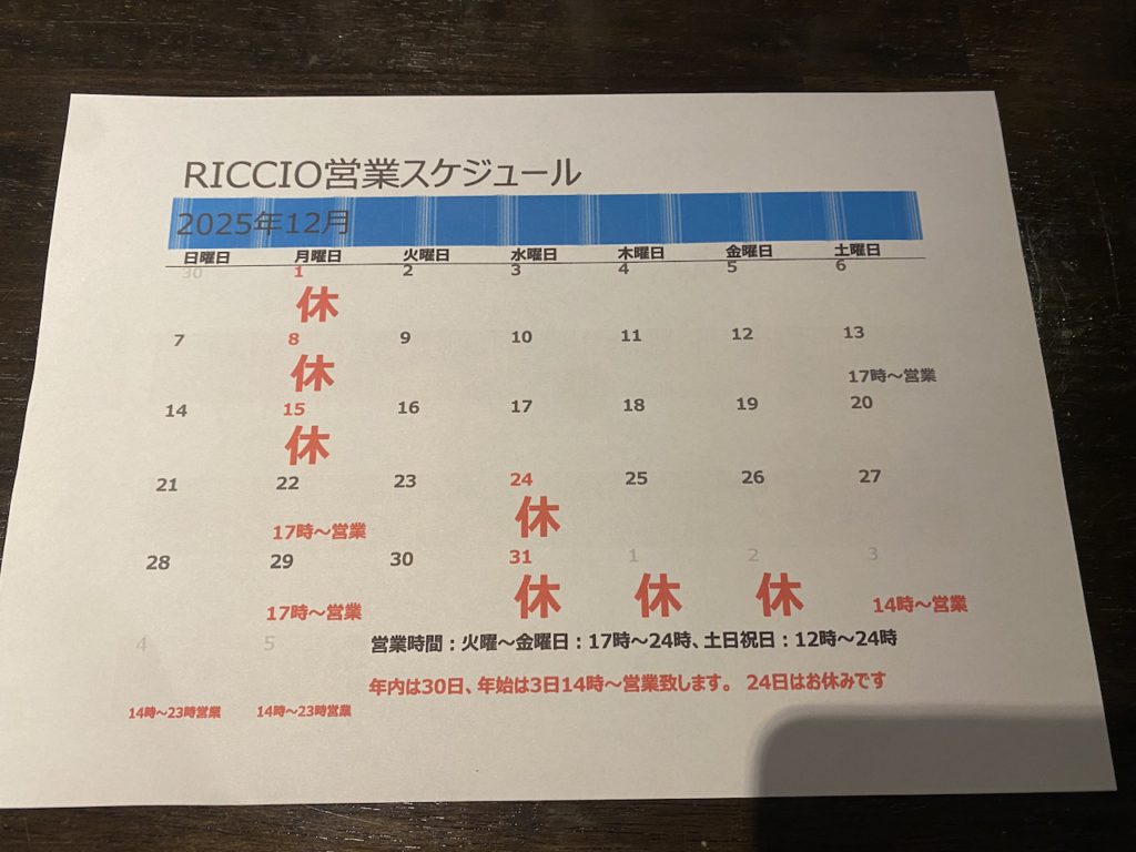 | 営業日 | 火~金曜日 17:00~24:00 土・日・祝 14:00~24:00 |