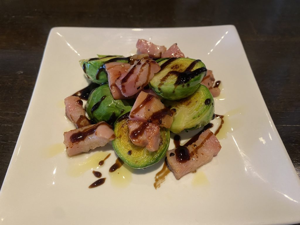 今月限定フード「芽キャベツとベーコン炒めバルサミコソース」芽キャベツが甘いです。